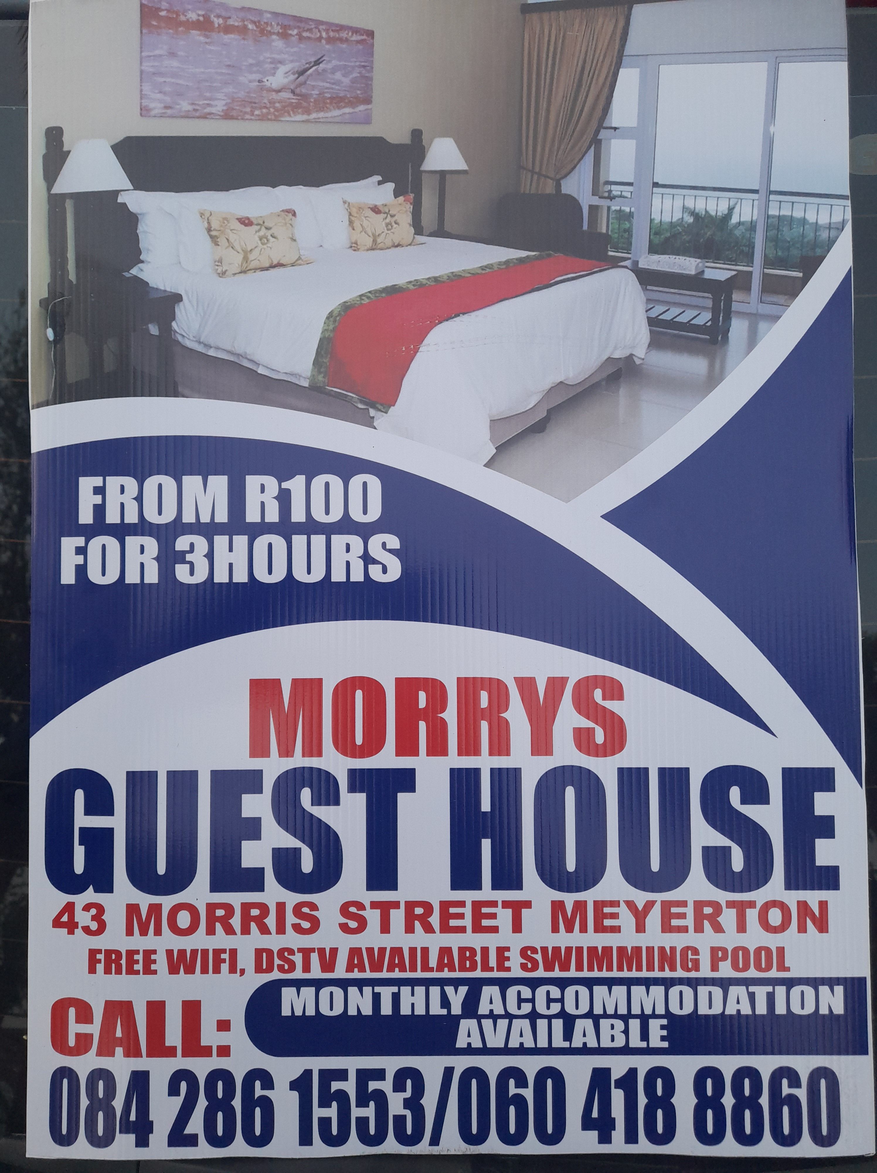 Morrys Guesthouse Located in 43 Morrys Street, meyerton, occupies a special place in our list if you are looking for a comfortable yet affordable stay in Meyerton. Located near to the town centre, the guest house provides free parking. With clean rooms and bathrooms, free WIFI and tea/coffee facilities, it is loved by visitors, especially couples. The guest house is run by a team of professional people and we want you to check this place out for sure. The average price per night is R200. Call 0817846033 o…
